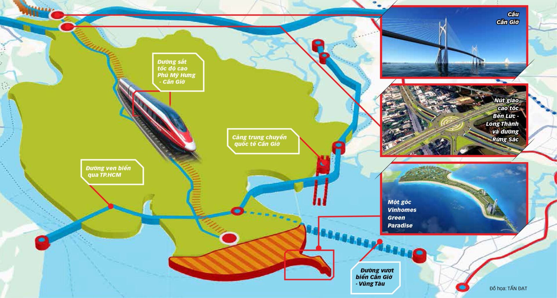 Đô thị lấn biển Vinhomes Green Paradise đang thi công rộn ràng; đường sắt đô thị tốc độ cao, cầu Cần Giờ, đường vượt biển đang đề xuất; đường ven biển, cụm siêu cảng cũng đang chuyển động mạnh mẽ… Tất cả sẽ hình thành một hệ thống giao thông đa phương thức, đưa Cần Giờ thành trung tâm mới.